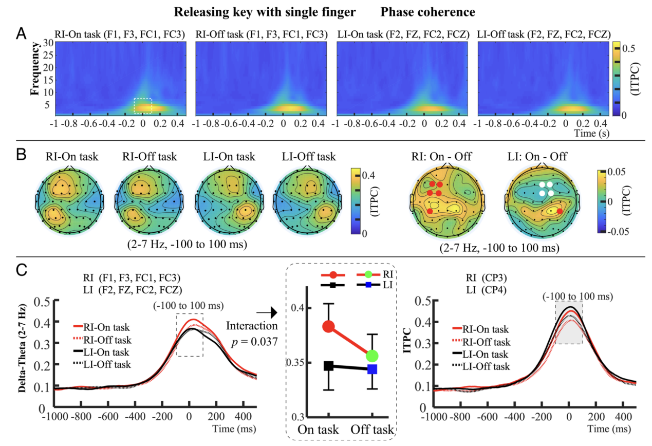 在实验3中,我们通过利手性(右手食指RI vs 左手食指LI)来操纵动作难度,考察抬键动作。结果发现,右手食指抬键的反应时显著快于左手食指,表明RI抬键相对简单。重要的是,心智游移仅降低了相对简单的RI抬键时对侧中央-顶叶区delta-theta频段(2-7 Hz)的ITPC,而对相对困难的LI抬键没有影响。