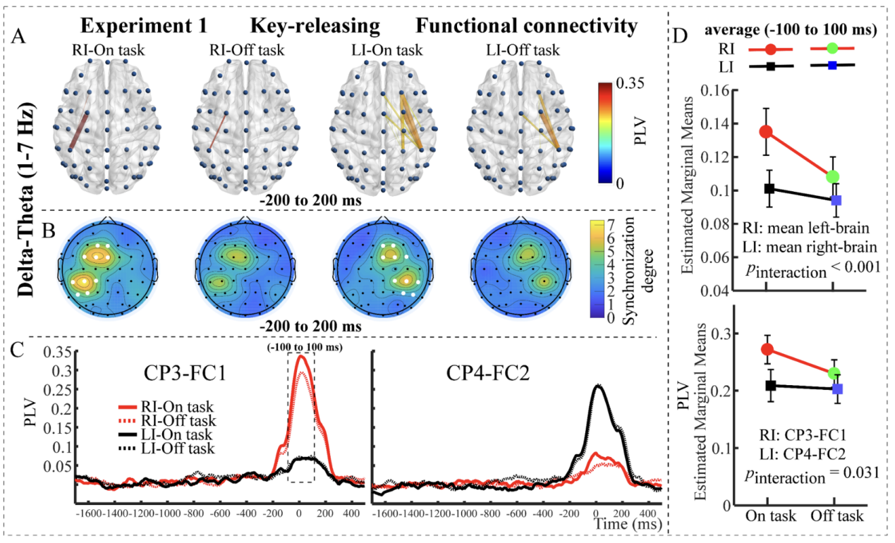 在实验1中,我们比较了右手食指(RI)和左手食指(LI)的按键和抬键动作。结果发现,右手食指抬键的反应时显著快于左手食指,且右手食指抬键诱发了更强的对侧delta-theta频段(1-7 Hz)功能连接。更重要的是,心智游移仅降低了右手食指抬键时的对侧delta-theta功能连接和额中区delta-theta活动,而对左手食指抬键没有影响。