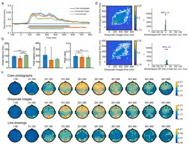 为了探究边缘、颜色及其他表面信息在基本和上位场景表征的作用,我们将每一场景分别以彩图、灰度图和线条图呈现。结合脑电图(EEG)和多变量模式分析(MVPA)方法,时间解码结果显示:在上位水平的场景表征中,线条图所含的边缘信息不仅足以完成分类,且其解码峰值显著高于彩图和灰度图像,这说明线条图中的边缘信息不仅充分,而且比彩图和灰度图更为有效;而在基本水平的场景表征中,彩图的解码准确率最高,且峰值潜伏期显著快于线条图,说明颜色和其他表面信息主要参与基本水平的场景神经表征。