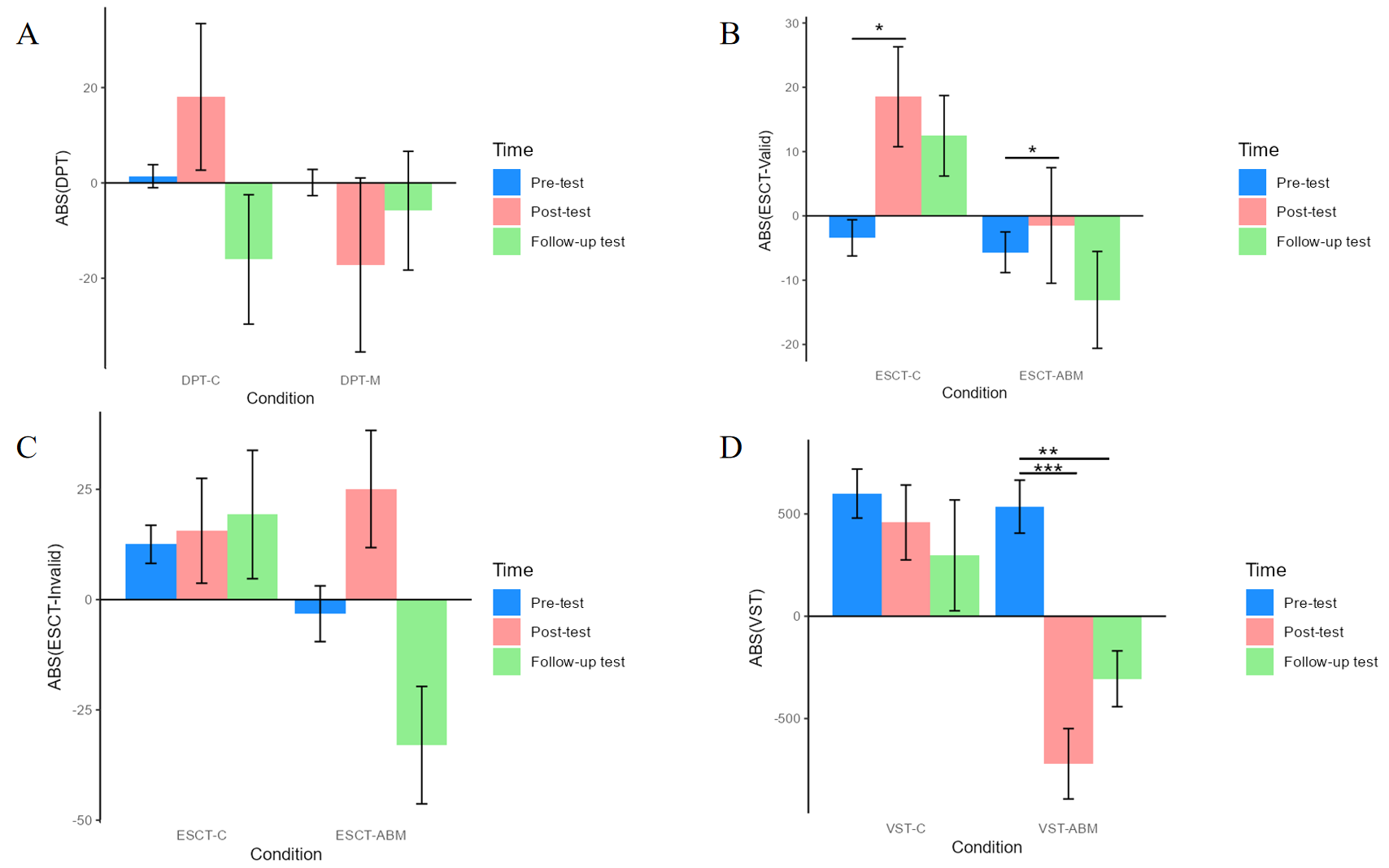 图2. 注意偏向矫正训练对注意加工的影响。三种注意偏向矫正训练(ABM)中的注意偏向分数:(A)点探测任务,(B)有效情绪空间线索任务,(C)无效情绪空间线索任务,(D)视觉搜索任务。