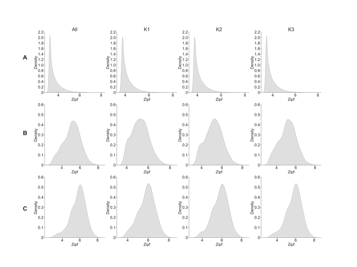 A) 总词汇库的词频分布和各年龄组词频分布;B)带声调音节的总词汇库频率分布和各龄组分布;C)不带声调音节的总词汇库频率分布和各年龄组分布
