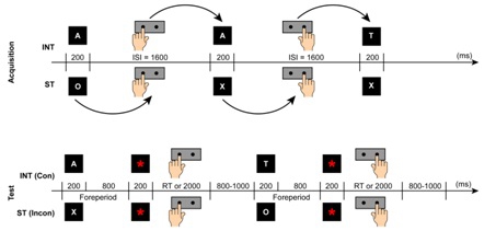 随着年龄的增长,老年人的运动功能出现减退,这不仅是由于神经肌肉功能的衰退,而且也受到认知功能衰退的影响。 目前已有研究报道认知功能影响运动加工的证据,例如,执行功能的衰退对老年人运动功能减退(如运动缓慢)的影响不仅存在于刺激加工阶段,也存在于运动准备阶段。对老年人实施运动训练可以改善认知功能尤其是执行功能的成绩。这表明执行功能可能在运动的认知加工中发挥着重要作用。 近来随着“观念运动理论(ideomotor theory)”认知神经科学研究的发展,对意图相关运动(intention-based action)的认知加工过程有了进一步的认识。顾名思义,意图相关运动是指人们为了特定目标而有意去实施的相应动作,这些运动所产生的效应能够实现人们的既定目标。意图相关运动的学习和提取表现为运动和效应之间的双向联接,即当运动和效应之间的联接建立起来后,人们还可以根据运动效应去反向提取相应的动作。可见联结记忆(associative memory)可能在该类运动中发挥重要作用。 基于此,中国科学院心理健康重点实验室李娟研究组通过开展执行功能结合记忆功能的综合认知干预研究,比较了综合认知训练对老年人意图相关运动vs刺激相关运动加工的不同影响。从社区招募的健康老年人被随机分入干预组(16名)和对照组(10名)。干预组接受16次认知训练,包括8次执行功能训练和8次记忆策略训练,对照组未接受训练。所有被试在前、后测中除完成一系列认知功能测评之外,还需完成一个“学习——测试”的脑电任务。任务要求被试在学习阶段进行基于意图和刺激两种运动类型的学习,在随后的测试阶段,被试被分为两个亚组,要求被试根据提示线索进行按键反应,两个亚组分别完成一致性或不一致性的线索反应(见图1)。根据前人研究,对于经过意图相关运动学习的运动-效应连接,在测试阶段会出现不一致任务的反应时显著长于一致任务反应时。