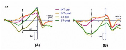 图1 实验流程图(INT:意图相关;ST:刺激相关) 在此基础上,李娟研究组使用运动准备电位(RP)、CNV和P3波幅对两种运动类型的3个认知加工过程(运动-效应绑定、效应-运动提取以及刺激-反应关联)进行了前后测比较。发现在综合认知训练后,执行功能成绩的提高与刺激相关运动的RP波幅增高呈正相关,且与意图相关运动一致任务下的CNV波幅的增高呈正相关。在CNV波幅上未发现类似于前人行为学研究所报道的意图相关运动不一致任务的干扰效应,考虑到记忆功能成绩也并未在干预后显著提高,认为这可能是由于被试接受的记忆训练时长较短所致。联结记忆是最易受年老化影响的认知功能之一,此研究中CNV干扰效应的缺失很可能就是由于老年被试的联结记忆功能已受损,即老年人已无法根据学习过的效应-运动连接区别出不一致的效应-运动连接。此外,由于所接受的记忆训练时长不足,记忆功能未得到显著提高,从而也未能改善意图相关运动的效应-运动提取过程。 图2 两种运动的RP波幅前后测比较(A:干预组;B:对照组) 以上研究提供了认知训练可以促进老年人运动加工的实证证据,并且为研究老年人记忆功能与运动功能之间的联系提供了新的研究思路和实验范式。由于意图相关运动对人们日常生活的重要作用,今后可在运动功能训练与康复活动中考虑加入联结记忆训练内容。 上述研究获国家自然科学基金(30900406,31070916,31271108,31470998,31671157)、中国科学院心理研究所青年人才科研启动项目(Y0CX0601S01)、中国科学院国家外专局创新团队国际合作伙伴计划(Y2CX131003)、中国科学院心理健康重点实验室(KLMH2014ZK02)资助。