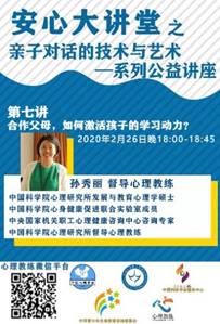 2月26日,抗击疫情“安心大课堂”亲子对话技术与艺术系列直播讲座进入第三天,围绕青少年学习动力、身心成长、独立思考能力三个方面的内容,进行了系列讲座的7-9讲。前两天的讲座,收获了大量的关注和很多家长朋友们以及心理学爱好者的好评,截止目前已超过10000人次的点击量。