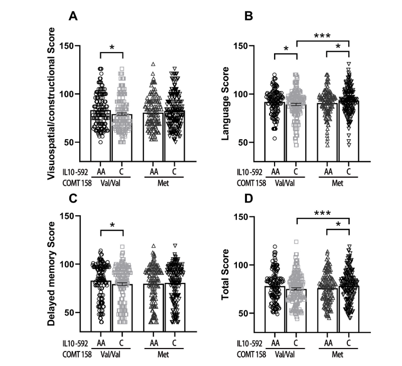 图1.IL-10和COMT基因型在视空间/结构(A)、语言(B)、延迟记忆(C)和总分(D)等认知维度上的事后检验结果(*p < 0.05, ***p < 0.001)。