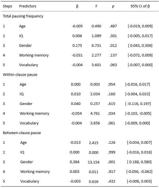表2. 年龄、IQ、性别、工作记忆、词汇和叙事中停顿的类泊松回归分析