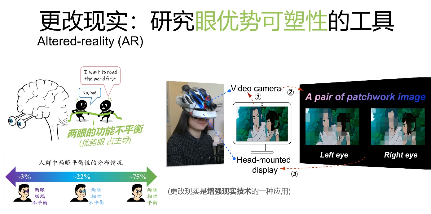 眼优势是动态变化的,随着视觉系统的发育和成熟表现出不同程度的可塑性水平。最近十多年的研究表明,一些视觉训练范式是能够调节成年人的眼优势的,但对其重塑的神经机制还处于初步探索阶段。在最近一个研究中,中国科学院心理研究所鲍敏研究组使用更改现实(altered-reality, AR)适应范式对两眼极端不平衡的成年弱视病人进行了连续 6 天、每天 3 小时的长时程适应训练。