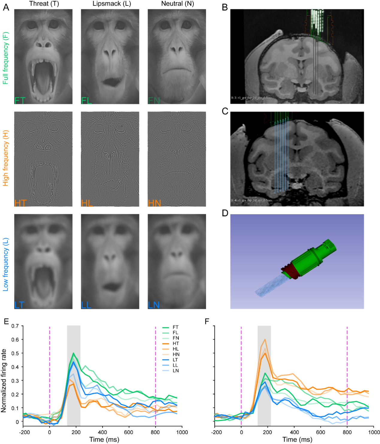 低空间频率(LSF)主要涉及面部情感的整体特征,而高空间频率(HSF)则关注细节和变化。该研究进一步通过fMRI发现,LSF的情感识别与杏仁核的功能具有遗传关联,而HSF则不存在这种关联。这表明LSF和HSF在面部情感识别中具有不同的神经基础,反映了它们在情感处理过程中的功能分工。通过对猕猴杏仁核进行在体的单细胞记录,该研究发现杏仁核存在加工LSF和HSF的不同神经元,进一步证实了LSF和HSF在面部情感感知中的区别(图3)。