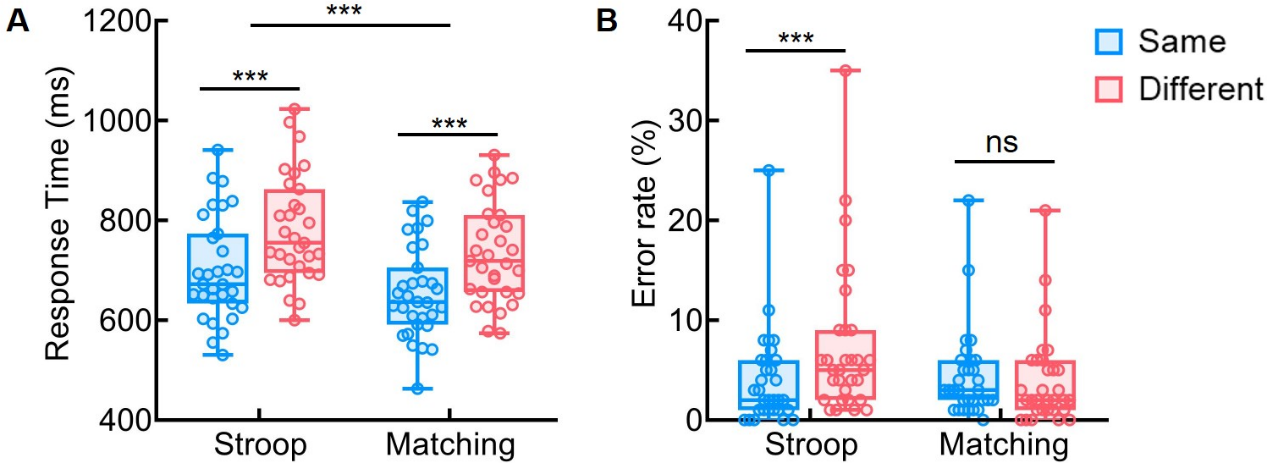 为了回答该问题,中国科学院心理研究所刘勋研究组的科研人员开展了一项研究,设计了视听Stroop任务(测量选择性注意)和视听Matching任务(测量分配性注意),并同时记录被试的脑电信号(N = 30)。两种任务的视听刺激相同,都包含相同和不同两种条件。但是两者指导语不同:Stroop任务要求被试对听觉刺激反应而忽略视觉刺激,Matching任务要求被试判断视觉和听觉刺激是否匹配(图1)。行为结果见图2,发现Stroop任务和Matching任务下的反应时在不相同条件下比相同条件下长。