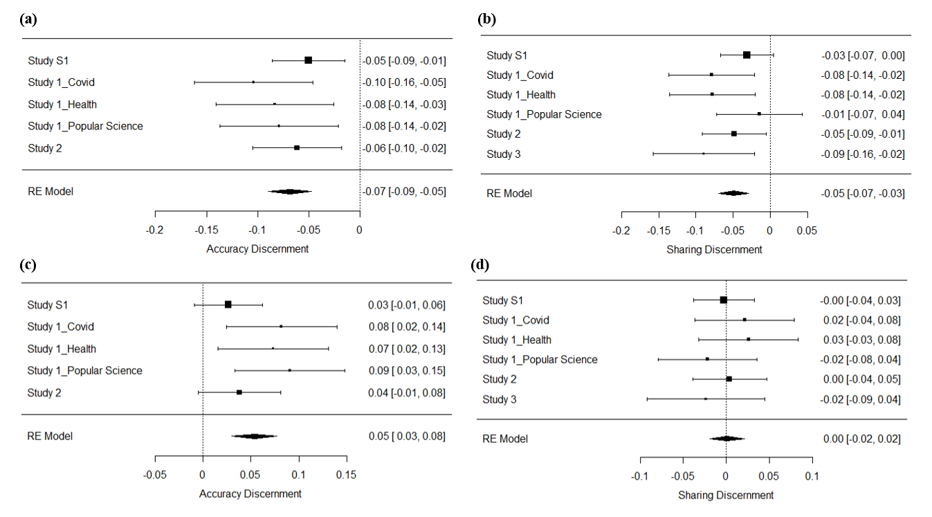 图1. (a)童年不确定性与判断分辨力;(b)童年不确定性与分享分辨力;(c)童年严酷性与判断分辨力;(d)童年严酷性与分享分辨力之间关系的效应量及95%置信区间