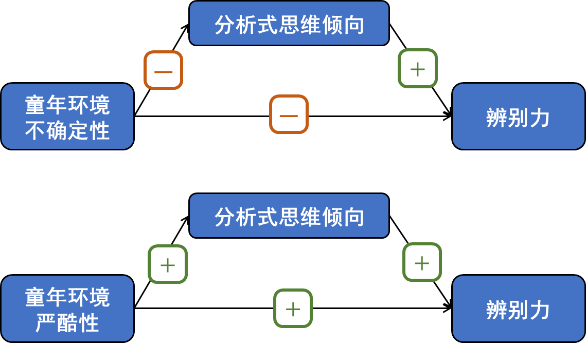 中国科学院心理研究所饶俪琳研究组的科研人员通过四项研究发现,童年环境的严酷性和不确定性对虚假健康信息的分辨力(包括准确性判断和分享决策层面的分辨力,以下简称“判断分辨力”和“分享分辨力”)起到不同影响。具体而言,童年环境的不确定性与更低的判断分辨力和分享分辨力相关,而童年环境的严酷性则与更高的判断分辨力相关(见图1)。进一步分析显示,童年环境的严酷性与不确定性对分辨力的不同作用可以通过分析式思维倾向来解释。个体童年环境的不确定性越高,其分析式思维倾向越低,进而导致分辨力的下降;而严酷性程度越高,分析式思维倾向越强,进而促进分辨力的提升(见图2)。