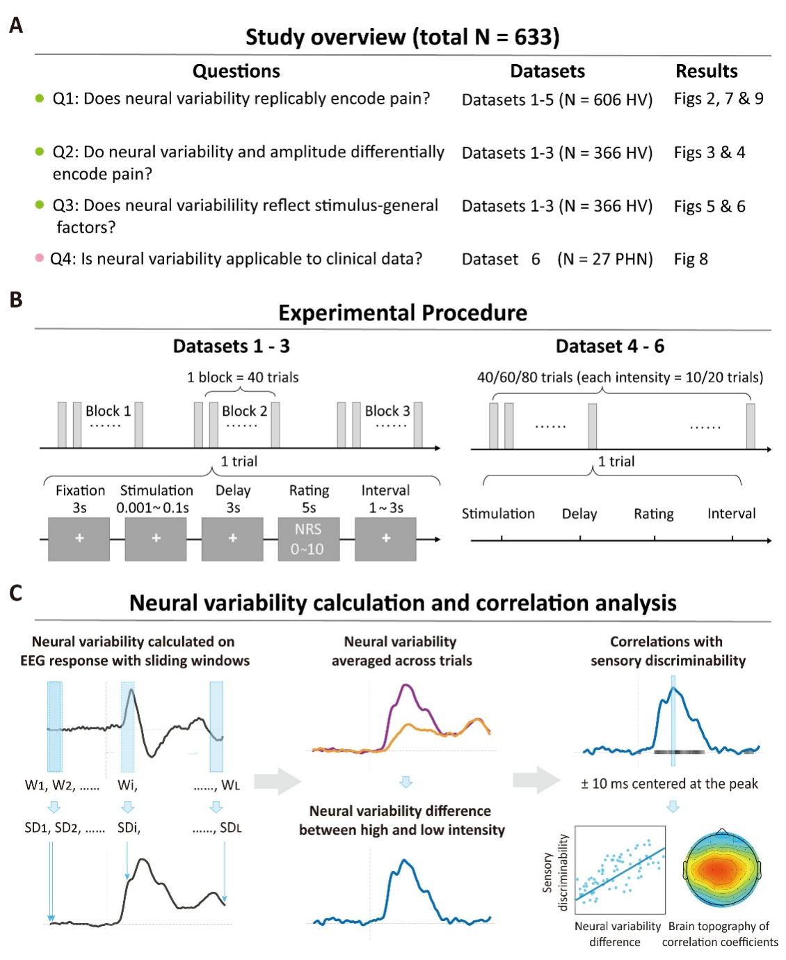 近期,中国科学院心理研究所胡理研究组利用总样本量共633人的六个脑电数据集(图1),系统探究了神经变异性和疼痛感知的关系,发现神经变异性可独立于脑响应强度编码疼痛分辨力的个体差异。