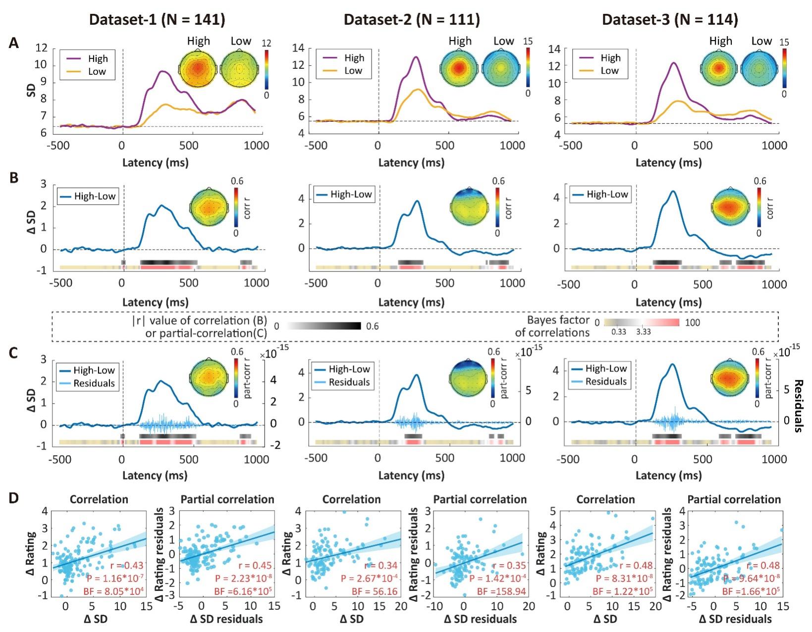 研究团队使用脑电信号在一定长度时间窗内的标准差作为神经变异性的主要度量指标(图1C)。疼痛感知则被区分为个体间和个体内两个方面:个体间疼痛感知表示疼痛感受性的个体差异,包括区分不同强度疼痛刺激的分辨力和感受单一强度疼痛刺激的敏感性;个体内疼痛感知代表个体对疼痛刺激的单试次状态性感知(Zhang et al., 2024)。分析显示,神经变异性和疼痛分辨力个体差异显著相关(图2;Dataset-1)。团队前期研究已发现N2、P2等脑电响应的强度可特异性编码疼痛分辨力的个体差异(Zhang et al., 2022)。排除了脑响应强度的影响后,研究团队发现神经变异性和疼痛分辨力仍有显著的偏相关。这意味着神经变异性可独立于神经响应强度编码疼痛分辨力。