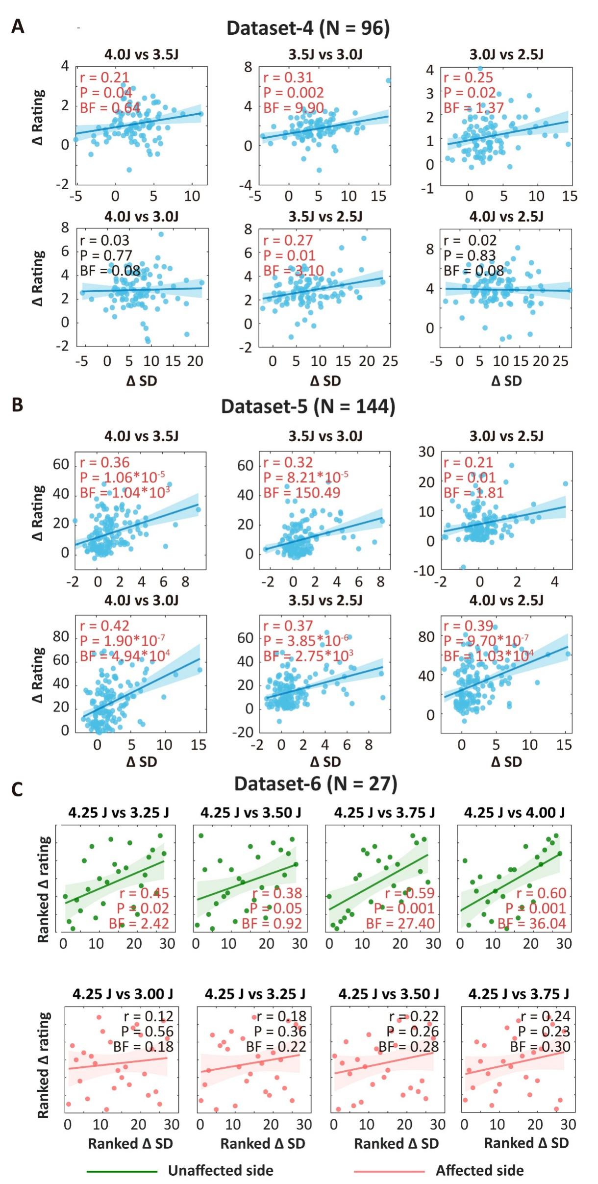 为系统验证研究发现的可重复和可推广性,研究团队在多个数据集中对结果进行了重复。上述结果在另外两个包含两个不同强度疼痛刺激的独立数据集中得到了完全的重复(图2;Dataset-2和Dataset-3)。除此以外,在包含四个不同强度疼痛刺激的独立数据集中,神经变异性依旧显示出对疼痛分辨力的编码能力(图3;Dataset-4和Dataset-5)。值得关注的是,带状疱疹后遗神经痛患者的非患侧手疼痛分辨力和神经变异性具有一定的相关性,但患侧手疼痛分辨力和神经变异性的相关却不再显著(图3;Dataset-6)。这意味着带状疱疹后遗神经痛可能损伤了神经变异性对疼痛分辨力的编码能力。