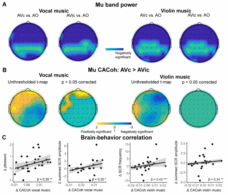 图1. Mu波能量(A)与Mu波-声音包络相干性(B)在视听一致和视听不一致条件下的差异,以及Mu波相干性与主观愉悦度和皮肤电反应的相关(C)