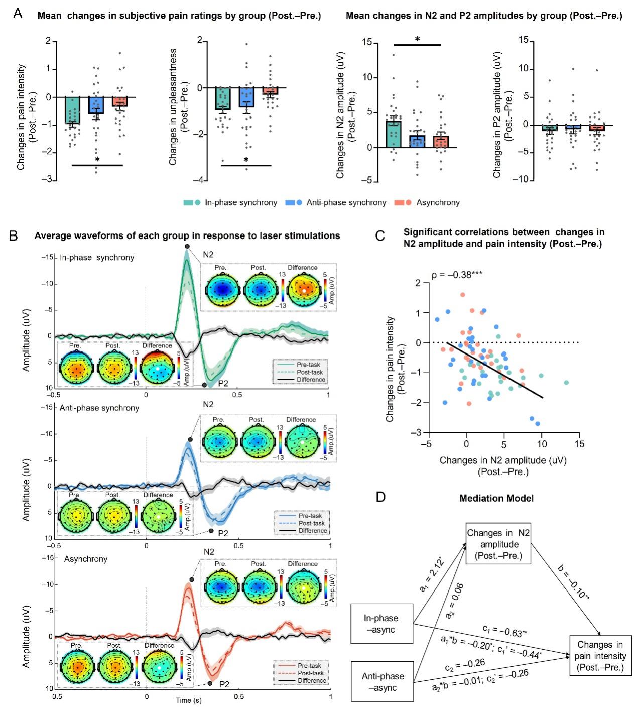 图3. 不同同步条件下疼痛评分、N2/P2波幅变化及N2波幅与疼痛强度的相关性、中介效应模型