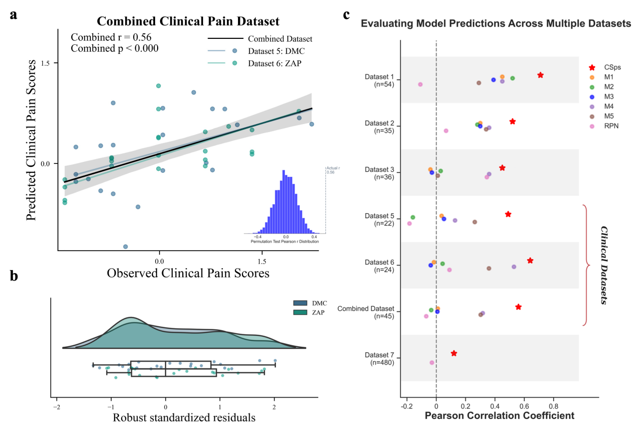 在临床应用验证中,研究者将CSps模型应用于两类不同病因的临床疼痛患者群体——亚急性期带状疱疹疼痛(ZAP)和糖尿病伴随慢性疼痛(DMC)。结果显示,基于健康人数据训练的CSps模型能够成功预测这两类患者的临床疼痛评分(图2a),且预测性能显著优于传统的仅基于脑部数据的模型或仅基于脊髓数据的模型(图2c)。这表明,整合了脑与脊髓信息的神经标志物能够捕捉到更核心的疼痛处理机制,架起了实验室疼痛测量与临床患者症状之间的桥梁。