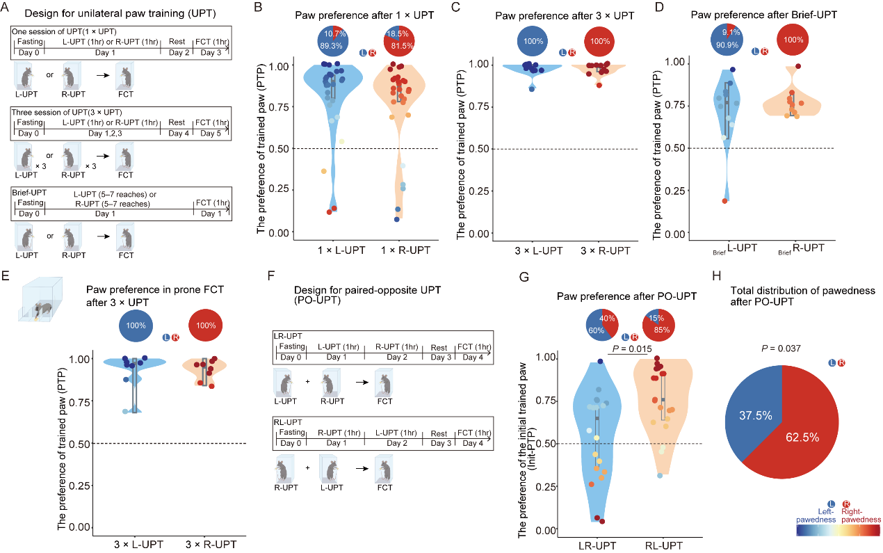 A–D:单侧训练后小鼠获得训练方向相同的利手性。A:不同程度训练的行为实验流程图;B:一小时训练(1×UPT)后小鼠利手分布;C:连续三天每天一小时训练(3×UPT)后小鼠利手分布;D:5–7 次限制性训练(Brief-UPT) 后小鼠利手分布(D)。E:俯卧式3×UPT后小鼠利手分布。F–H:反向逆转训练后小鼠群体利手右偏。F:反向配对训练的实验流程图;G:反向配对训练(PO-UPT)后小鼠利手分布;H:小鼠群体利手分布