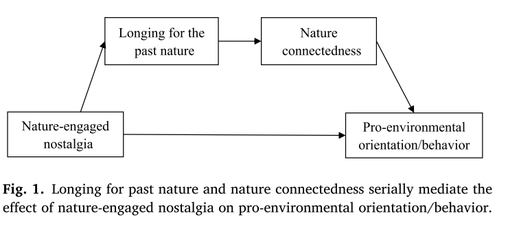 在进一步的实验研究中,研究者通过事件回忆任务诱发参与者的怀旧情绪,并比较自然怀旧和一般怀旧对环保取向和环保行为的作用。结果发现,诱发怀旧情绪的参与者表现出更强的环保取向和环保行为,其中自然怀旧的效果尤为显著。进一步中介分析表明,怀旧对环保的促进作用主要通过两个连续的心理过程实现:自然怀旧会激发个体对“过去自然”的怀念,进一步增强个体与自然之间的情感联结,并最终促进个体产生更积极的环保态度和更多的环保行为(图1)。