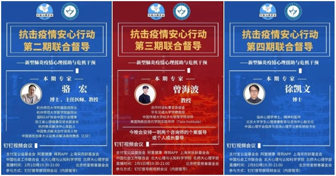1月31日,首期联合督导由中科院心理所史占彪教授主持,135位心理援助者在钉钉视频直播平台参与联合督导。史占彪从后现代心理教练的视角与10位心理援助者进行了深入督导对话。探讨的话题包括:疫情创伤应激反应处理方法、心理援助的保密原则、危机干预应对与人格完善的关联、如何在30分钟内做好心理援助者的安抚与支持等。